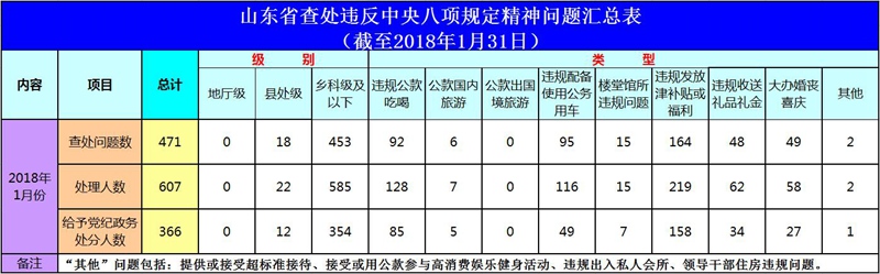 2018年1月,山东省各级纪检监察机关查处违反中央八项规定精神问题471起,处理607人,给予党纪政务处分366人。
